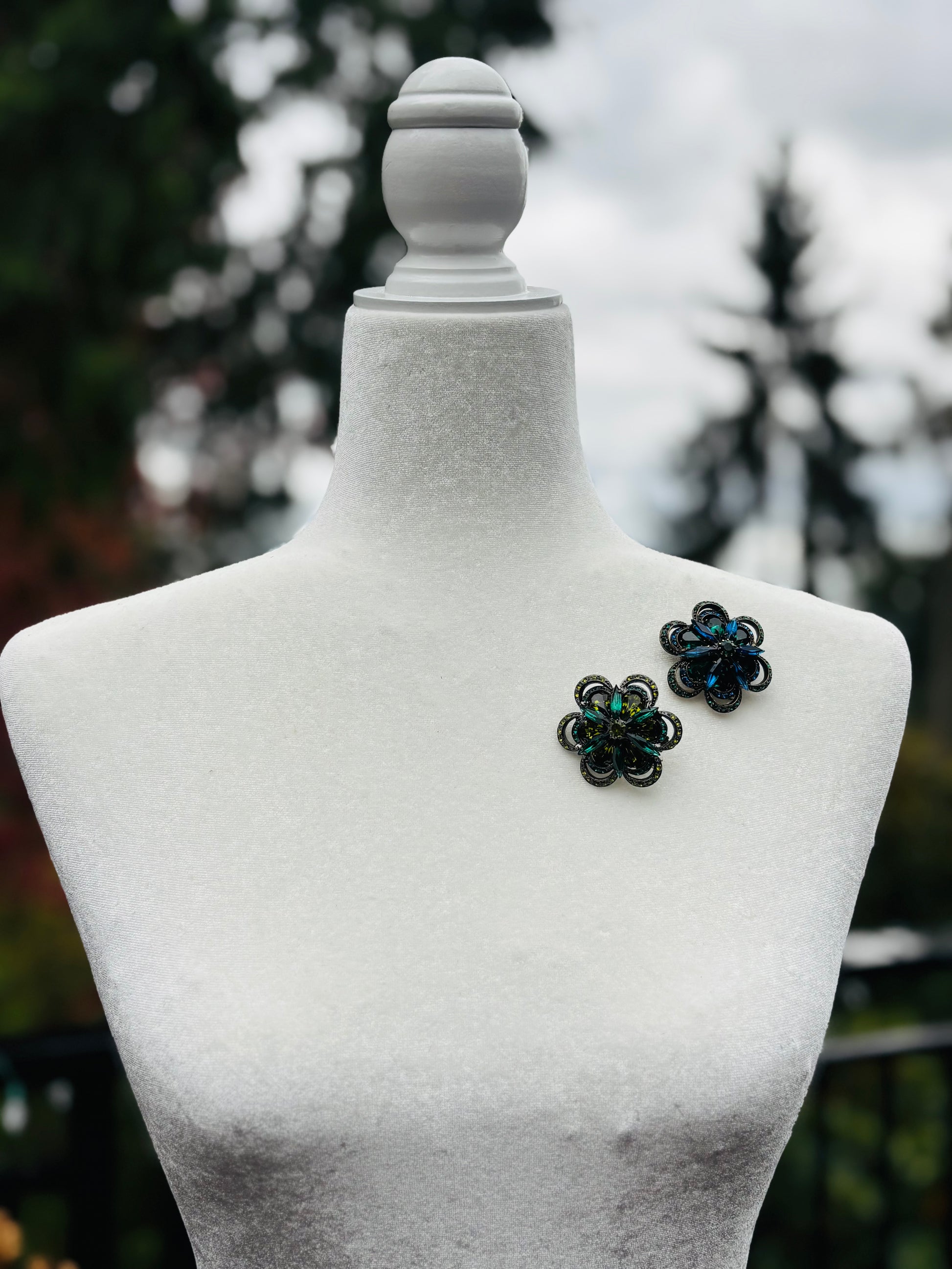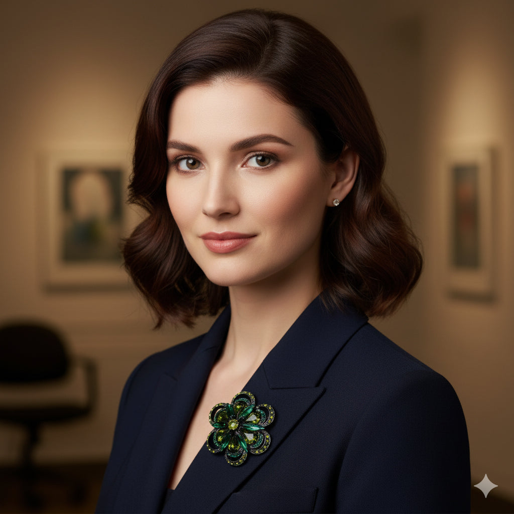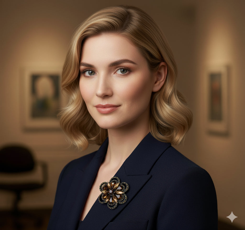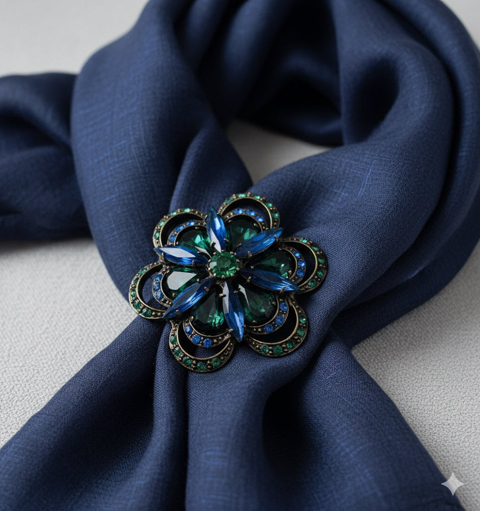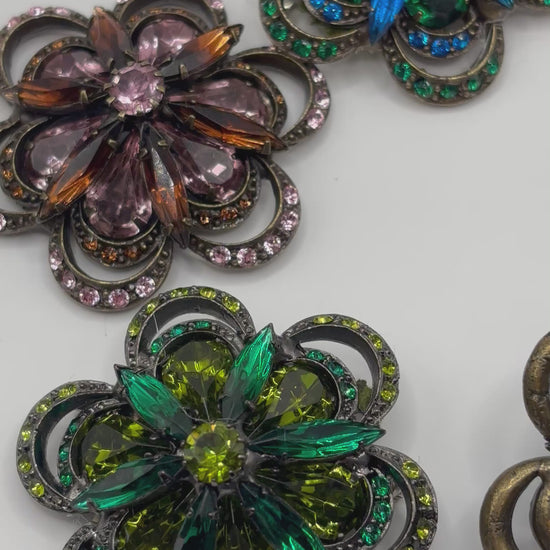 “Mae” Brooch. 1.75" - Made in the USA. Pin to your lapel, dress, scarf, hat and more. Bejeweled