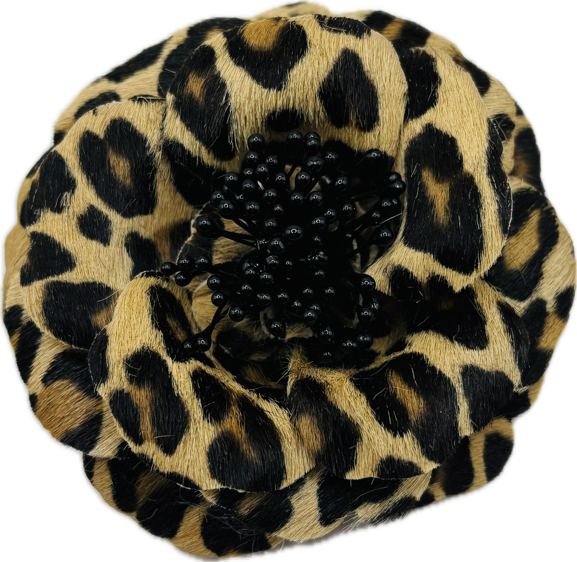 Samatha Real Leather Faux Leopard Rose Pin-Clip Duo. Black shiny seeds in the center. Approximately 3” Made in the USA. Clip into hair, onto lapel, onto necklace, onto dress and more.