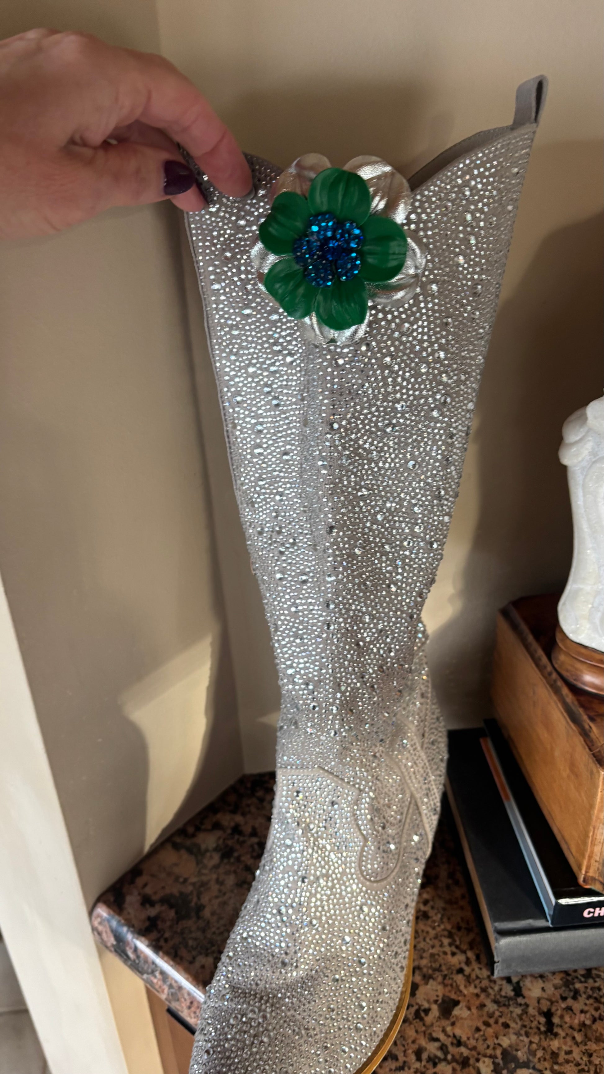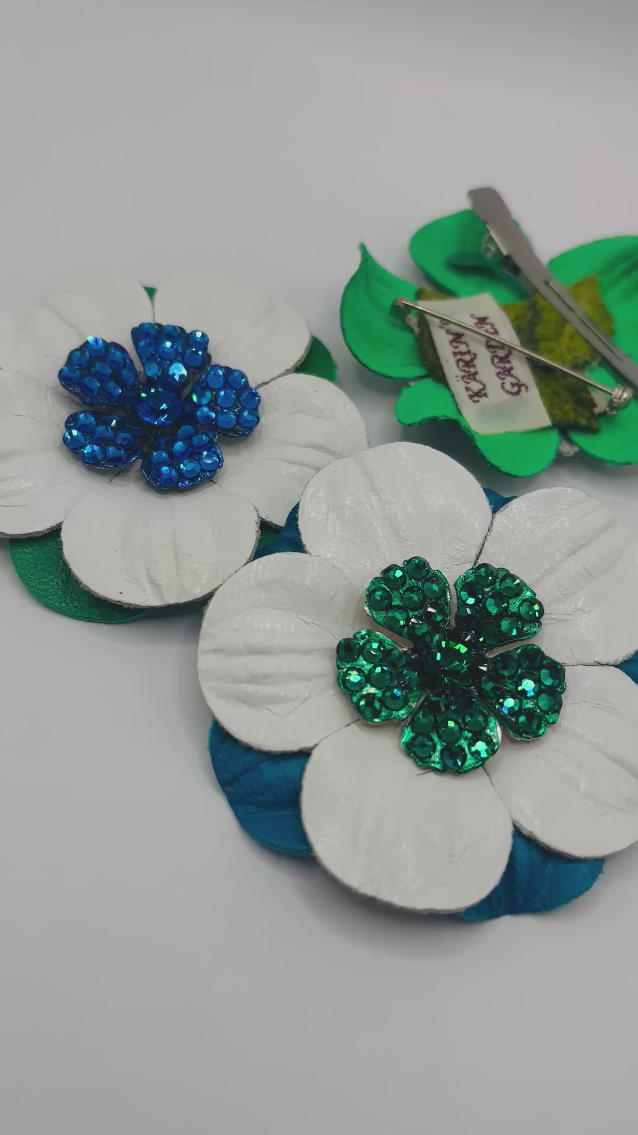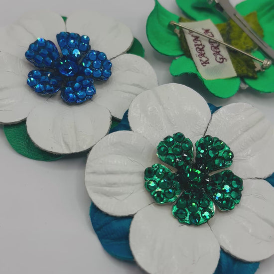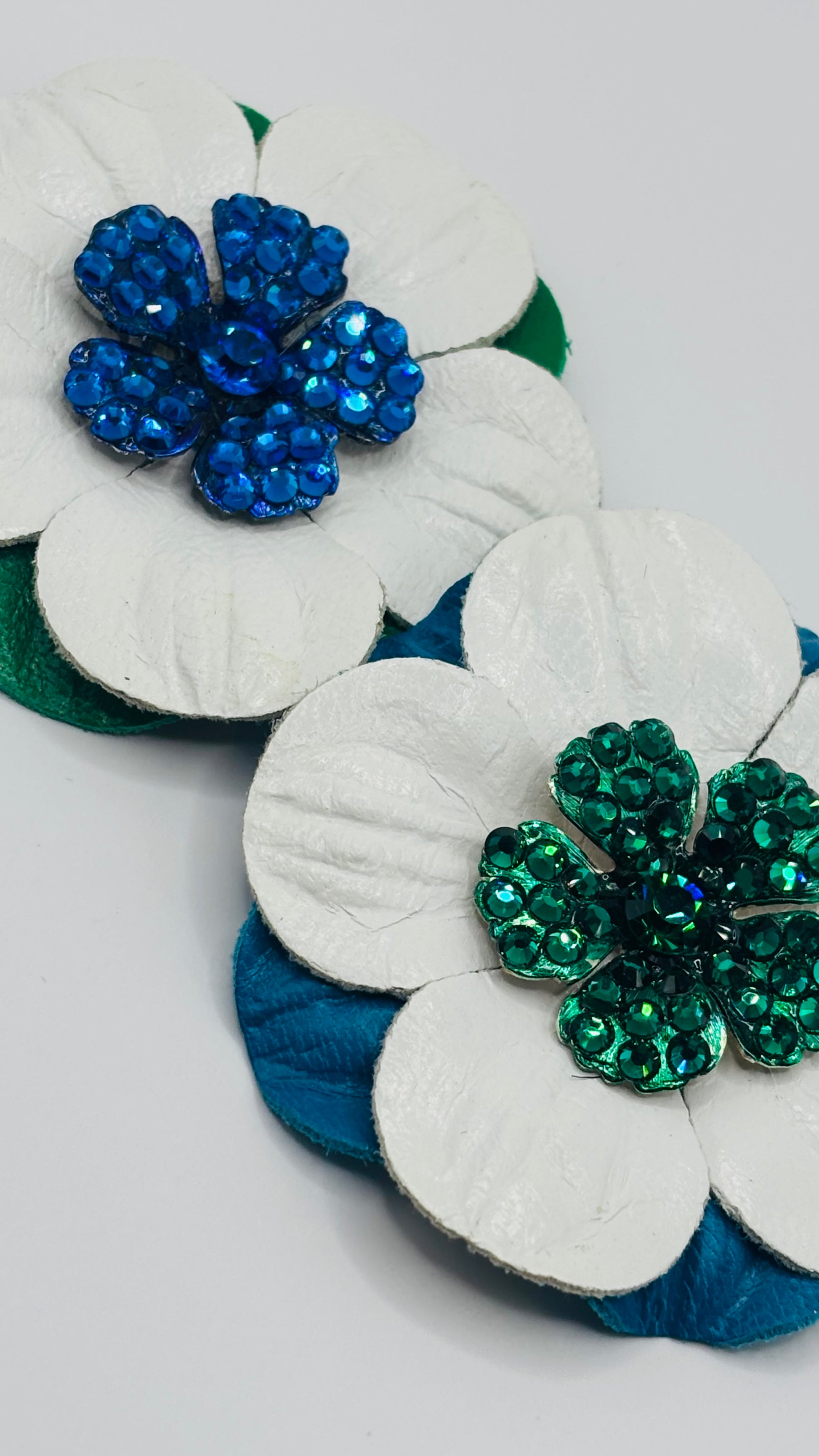 “Seahawks" 2.25 Petite Leather & Crystal Flower Pin & Clip. White with Blue Center. Made in Seattle, WA