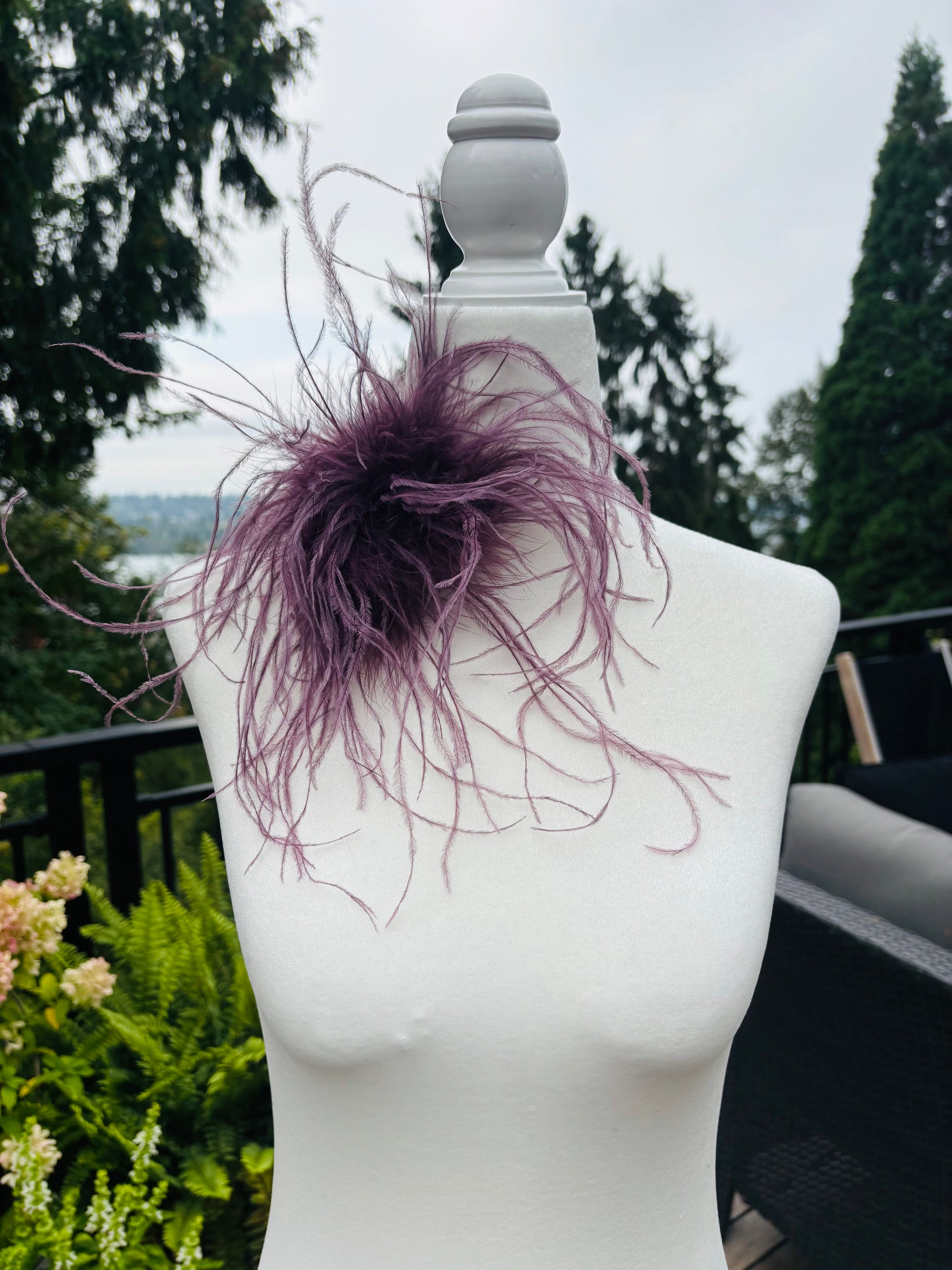 "Dietrich" Petite Ostrich Pin & Clip. Made in the USA. Please message with any questions. Pin or Clip into hair, onto lapel, onto dress, clip to handbag, clip to choker, wear as a boutonniere, clip into pony, wear as a wristlet clipped to a ribbon, elastic or bracelet, wear on a hat & more. Use as a brooch, a clip & more! This style is the Petite in Velvet Aubergine. I also sell it in the Dietrich Grand style.