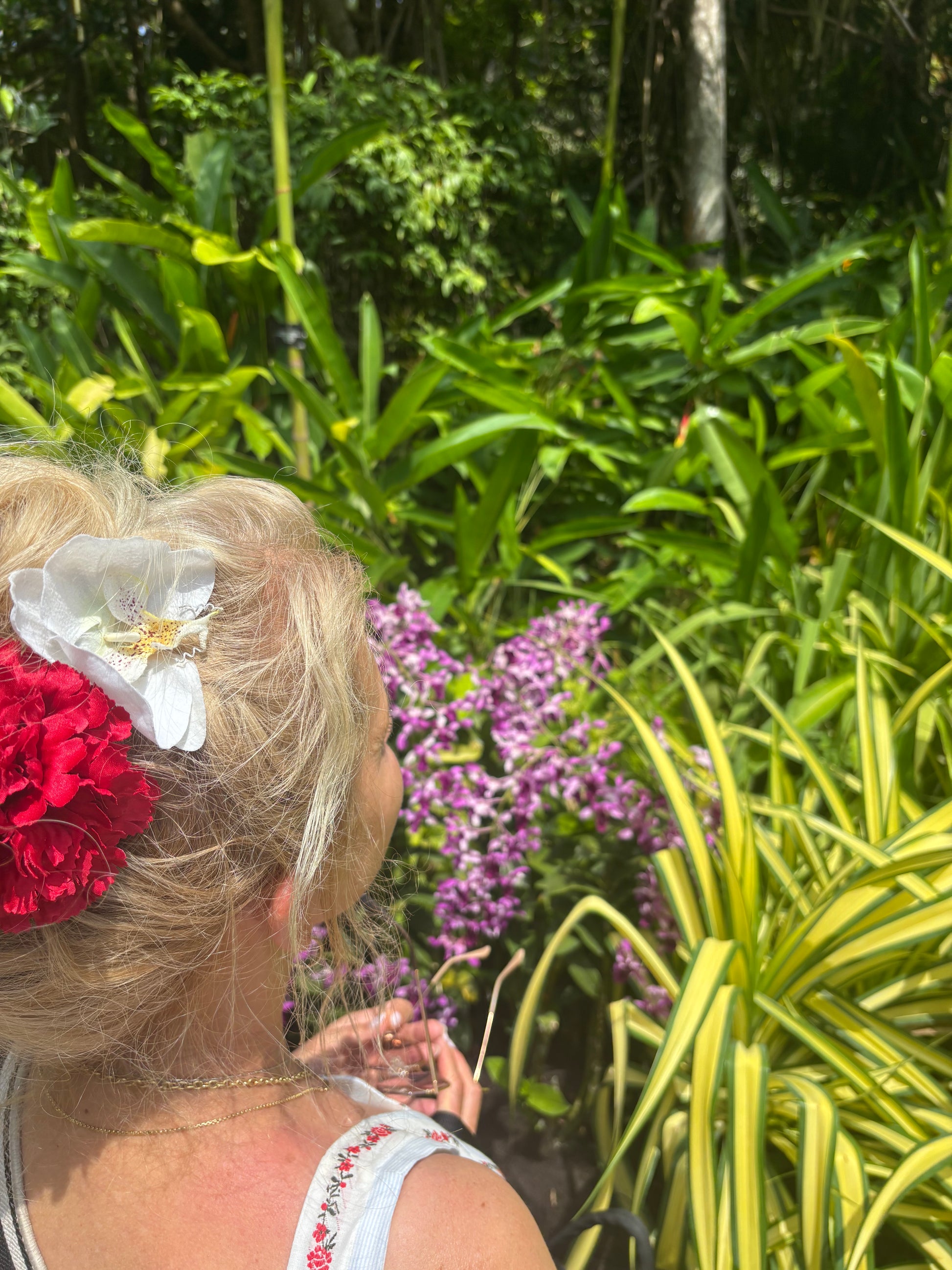 Karin's Garden Stella 3 1/2" Phalaenopsis Orchid Clip Easy Pinch Clip Style Handmade in the USA As Seen In: Cosmopolitan Magazine Bendable petals. Lifelike tropical flowers in your hair or pinch clip onto your dress or handbag Tropical vacation ready! Beautiful you!
