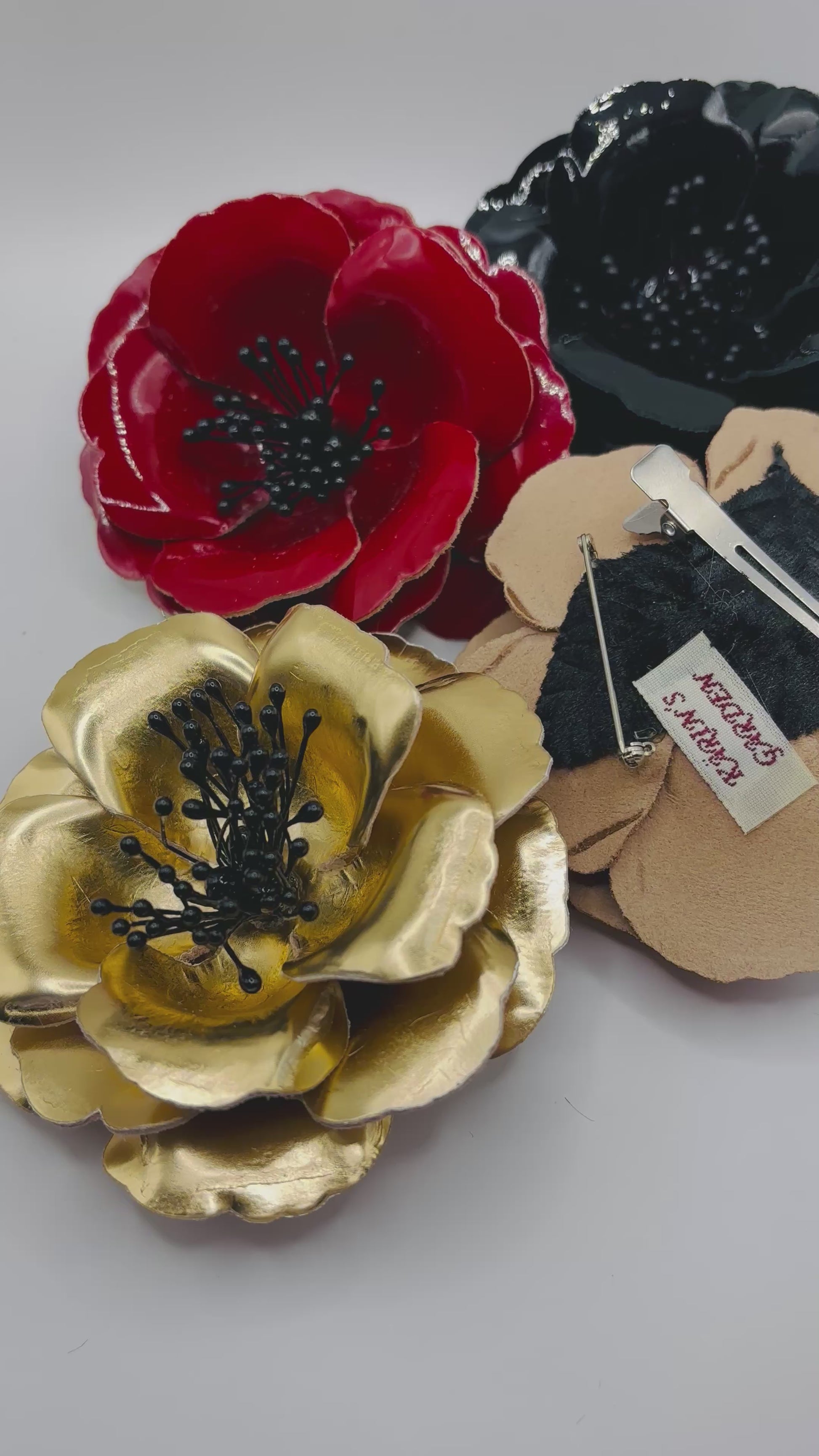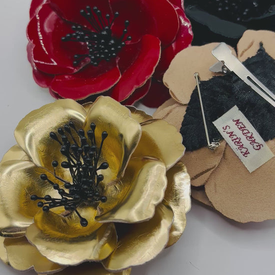 Karin’s Garden 3” “Cecconis” Black Patent Leather Rose Pin-Clip Duo. Black shiny seeds in the center. Approximately 3” Made in the USA. Clip into hair, onto lapel, onto necklace, onto dress and more.