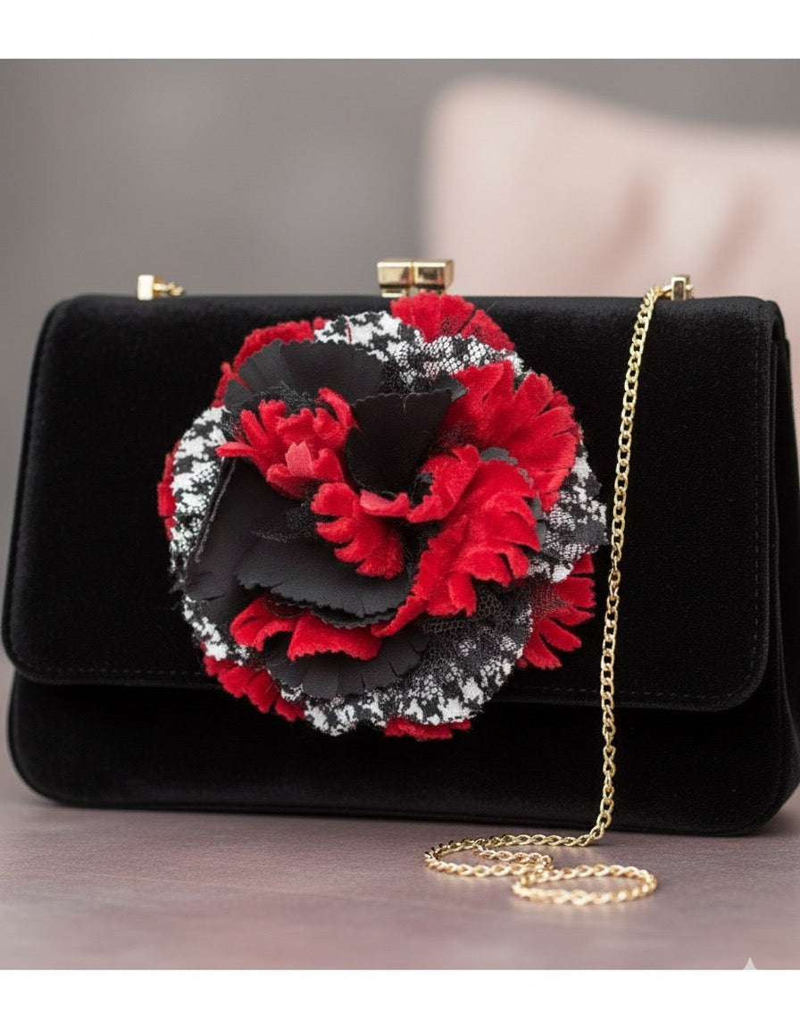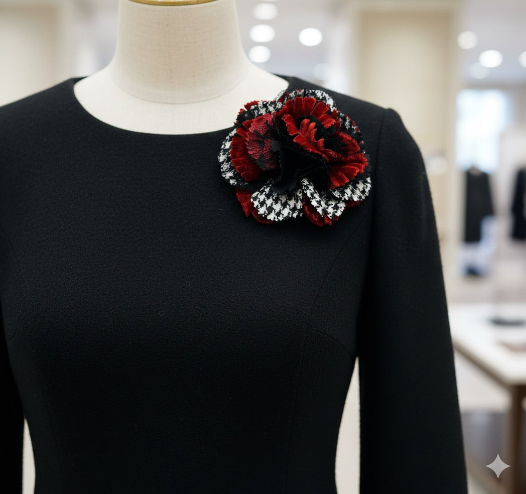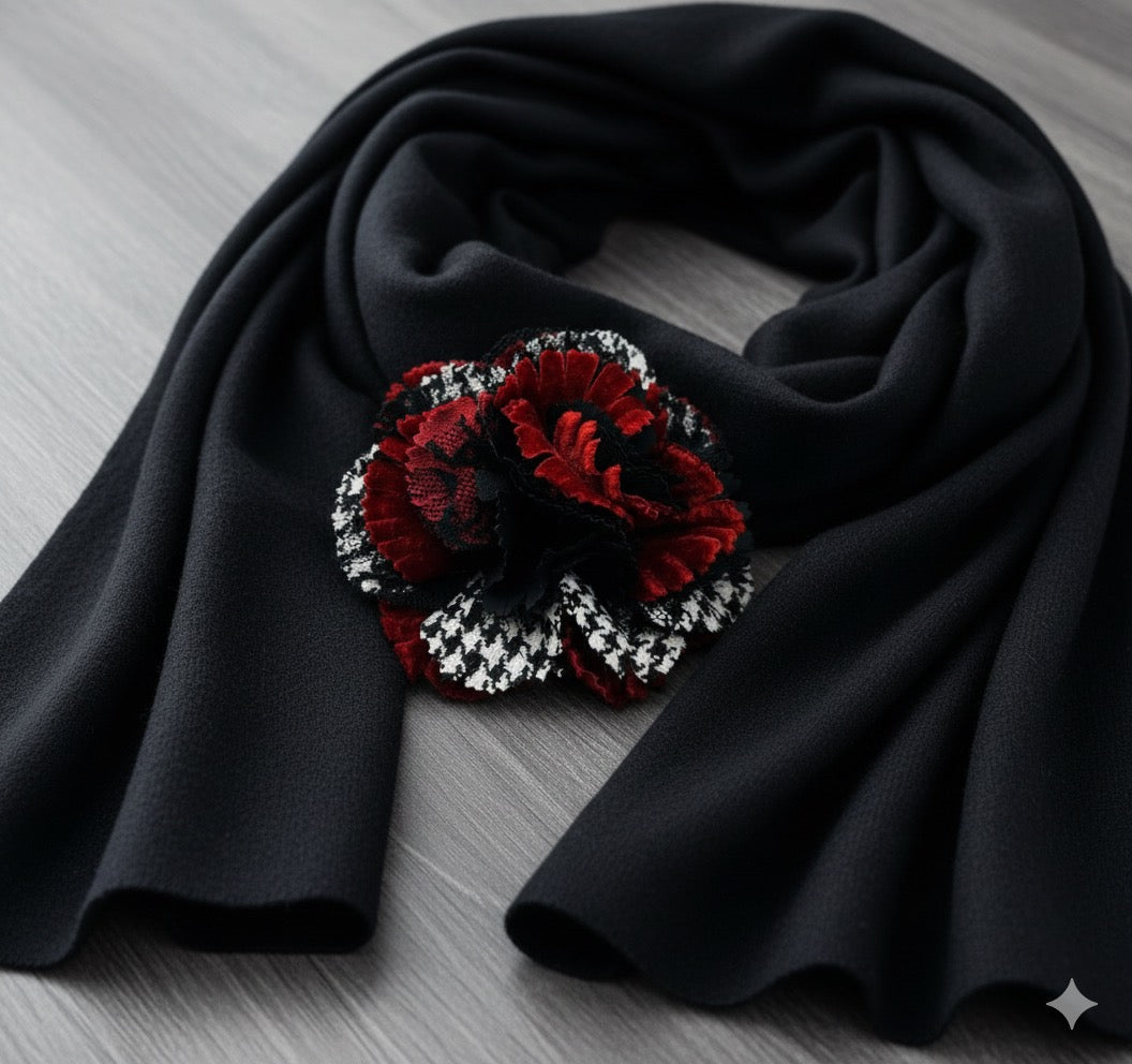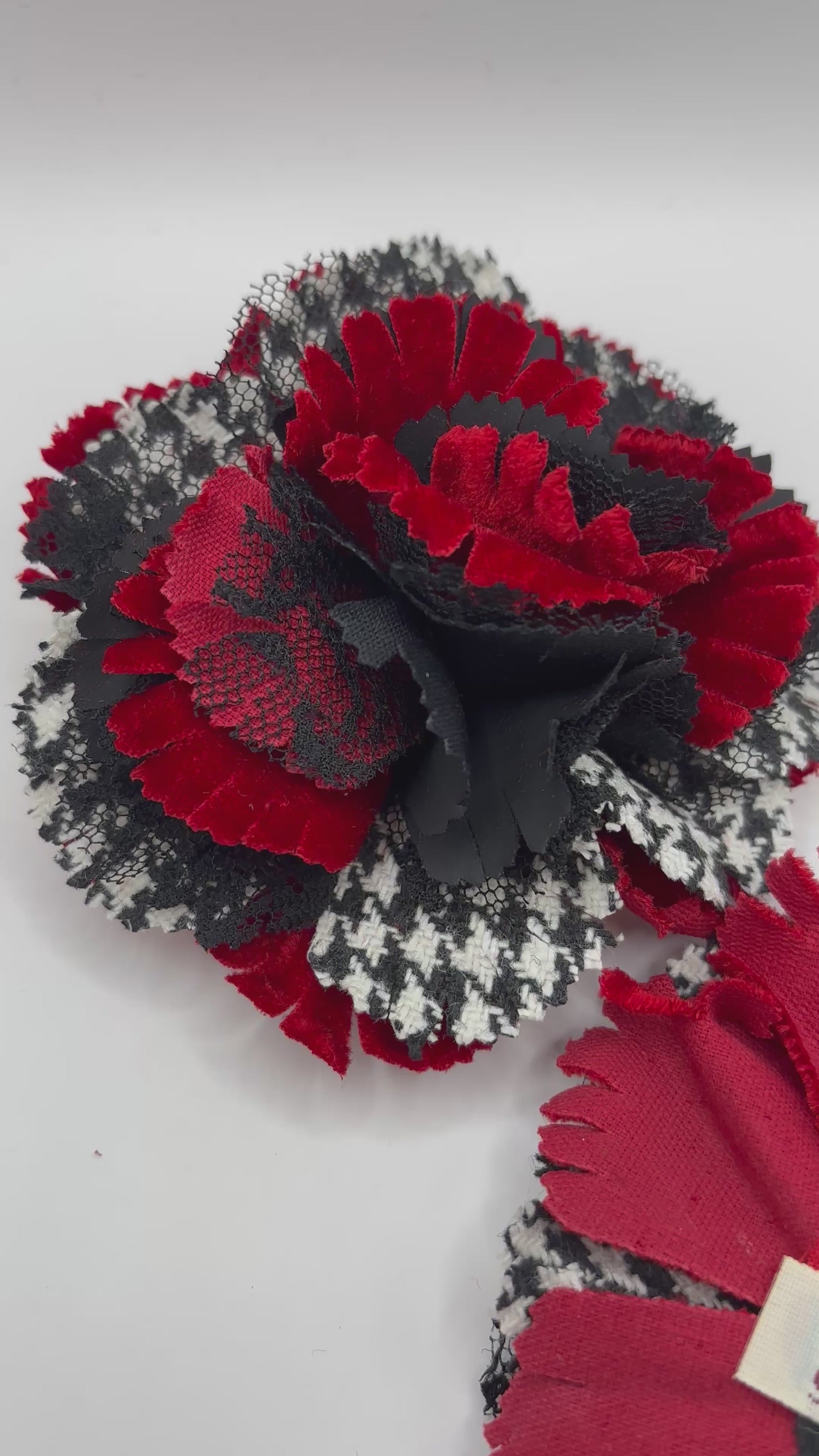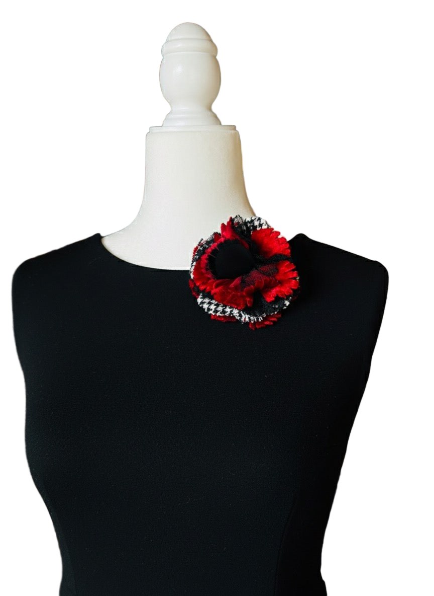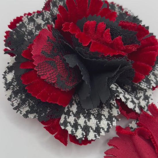 "Brooke" Red White & Black Wool Houndstooth Velvet & Lace Flower Brooch and Clip 3" Made in the USA with Love