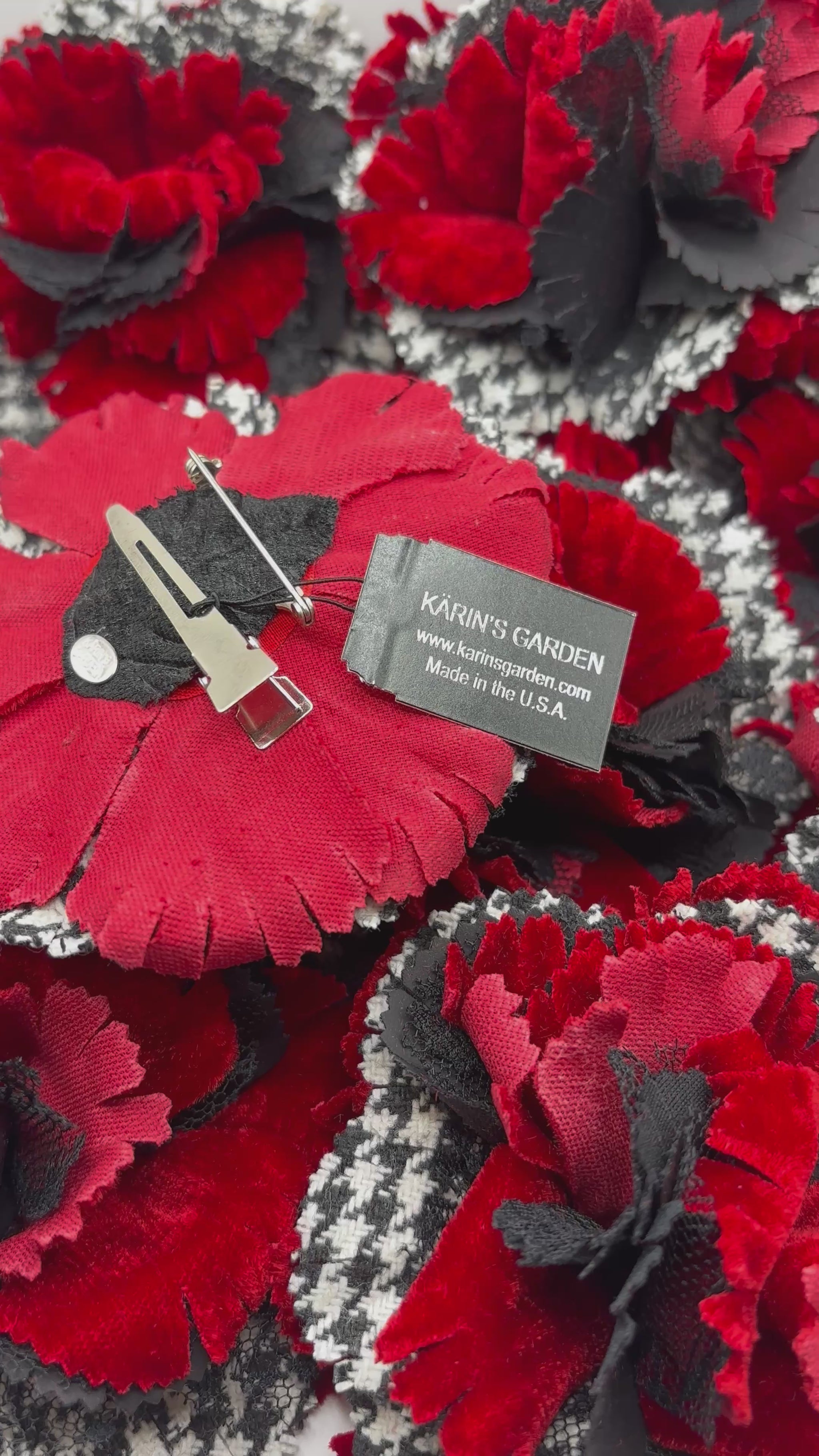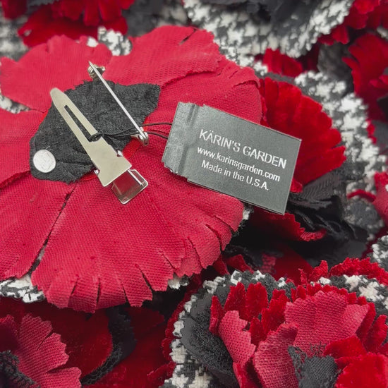 Karin's Garden Red White & Black Wool Houndstooth Flower Pin or Clip: For Hair, Lapel, Coat, Dress, Purse, Scarf, Hat and More. A statement look!