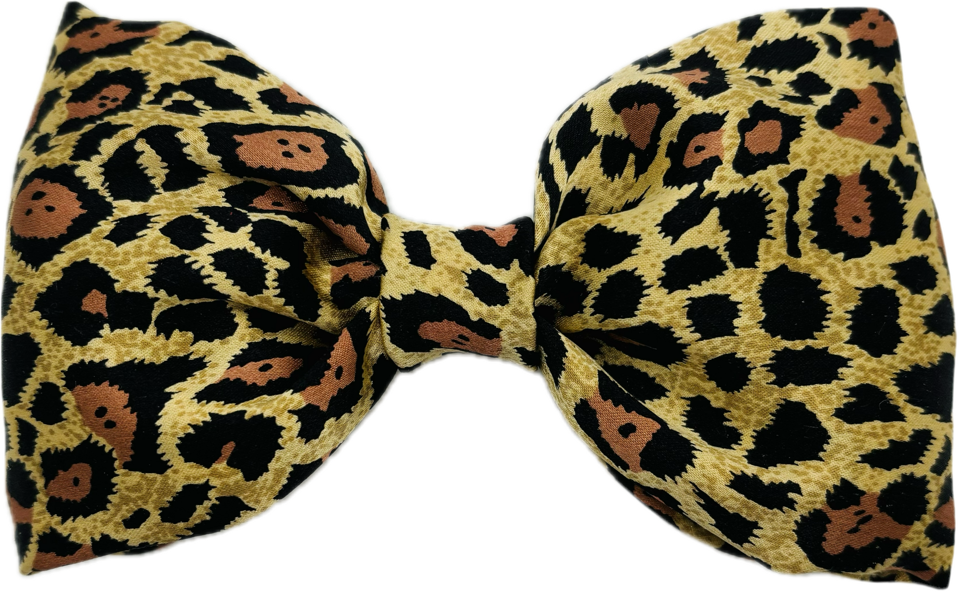 Silk Charmeuse Leopard Print Bow Barrette. 5 1/2” long. Metal clip made in France. Product made in the USA.