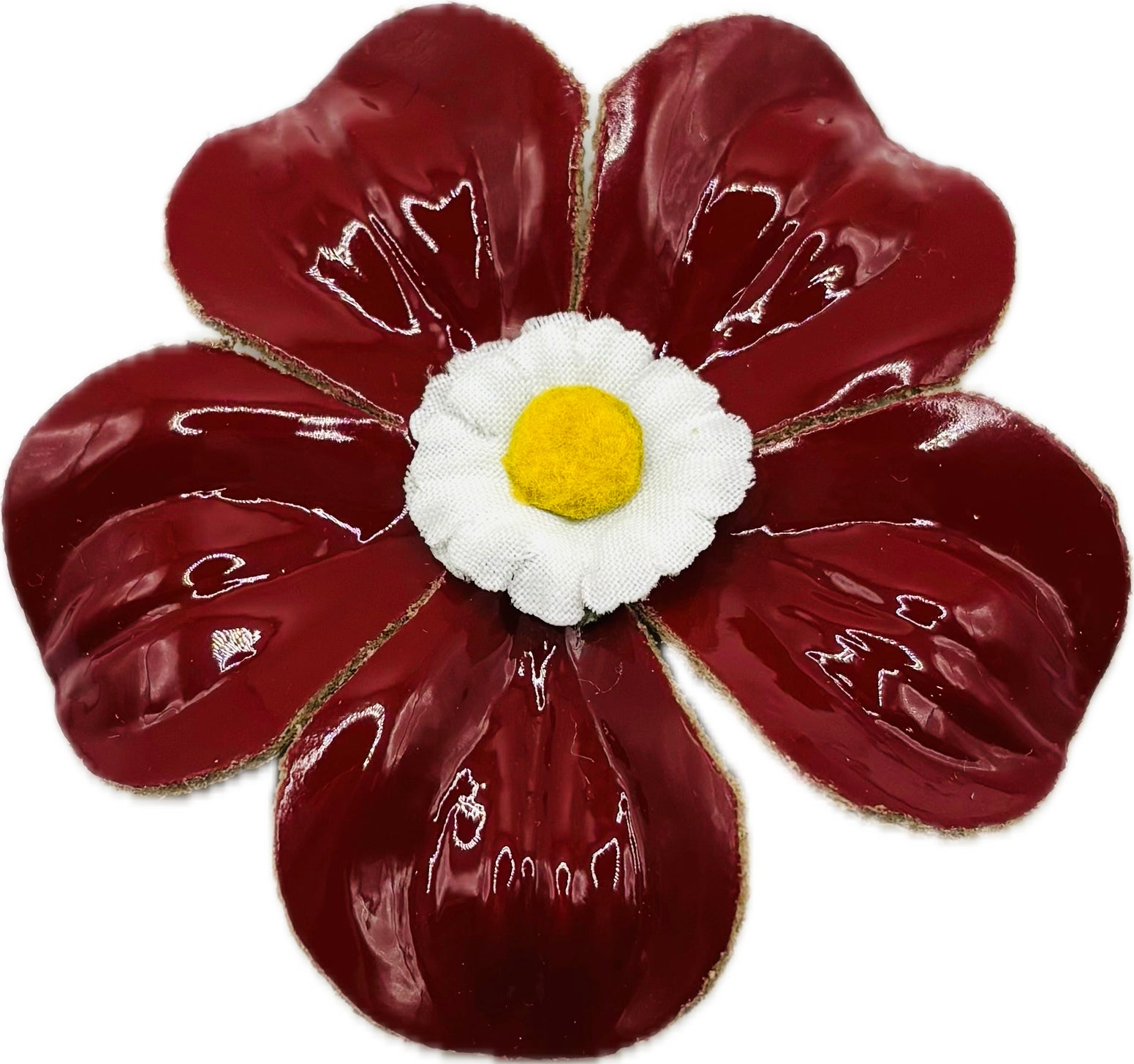 “Marguerite” Striking Red Patent Leather Daisy Flower Brooch & Clip. 2.25" Wear in your hair, on a necklace, dress, lapel, on a hat and more. Made in the USA