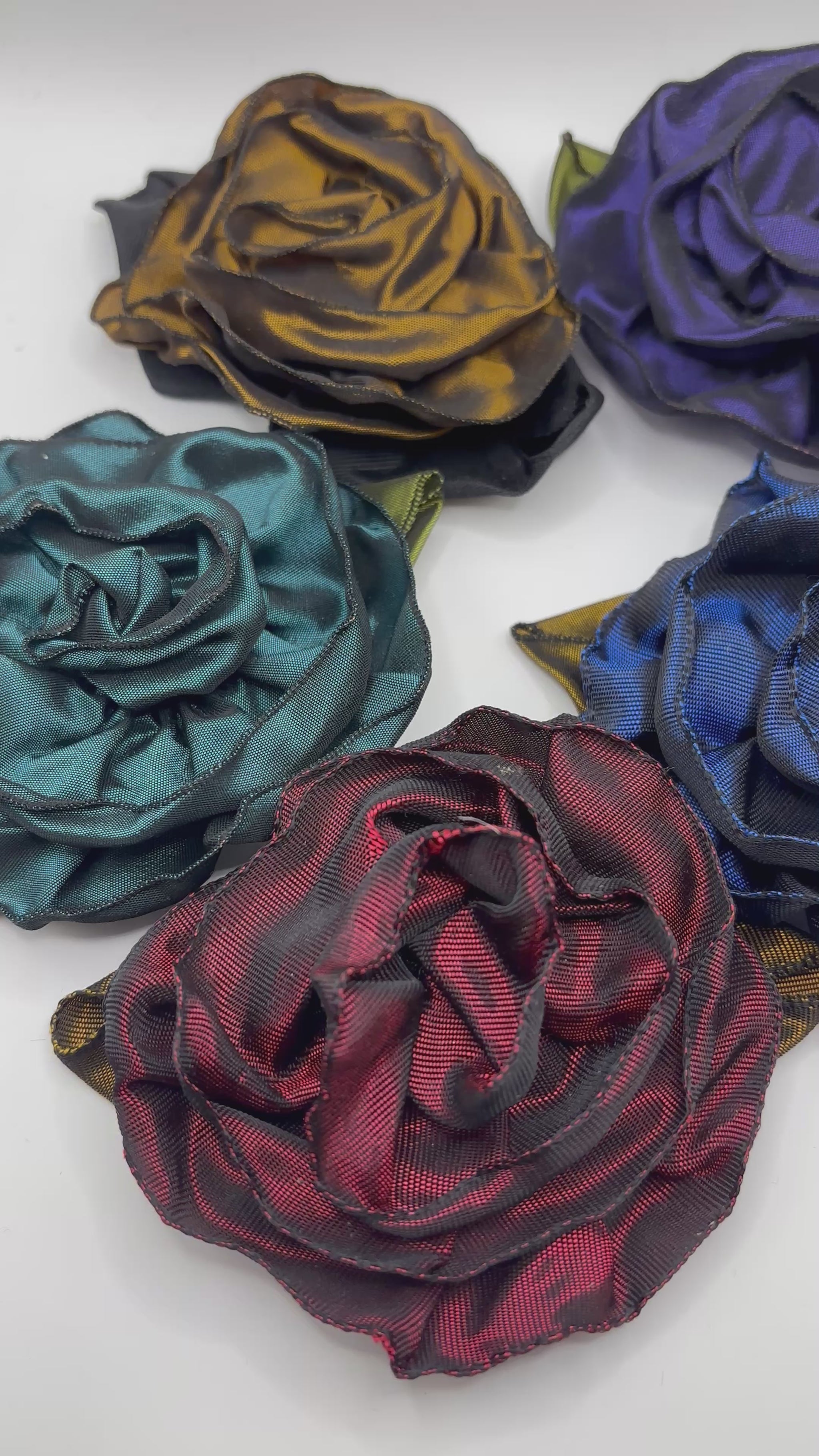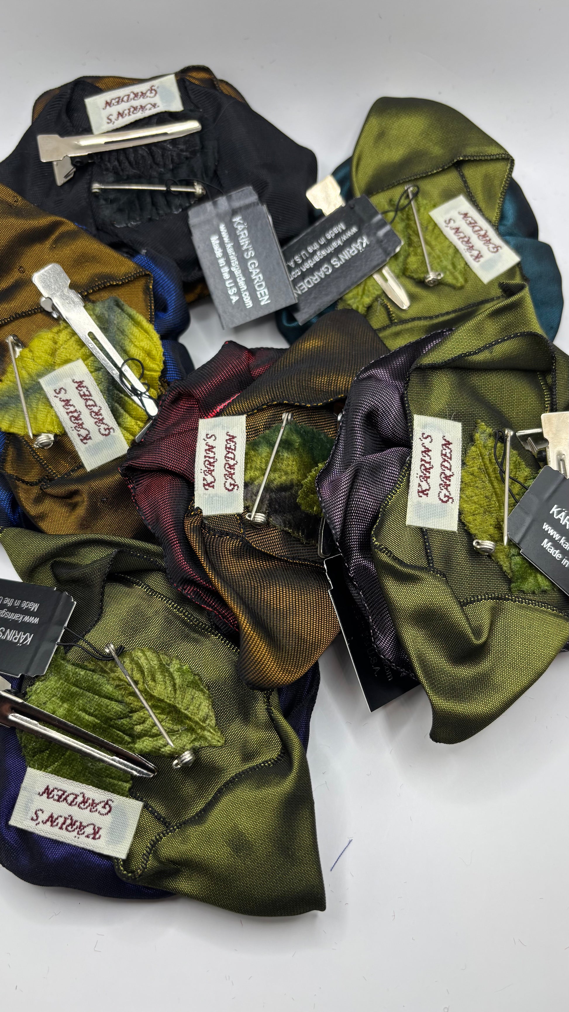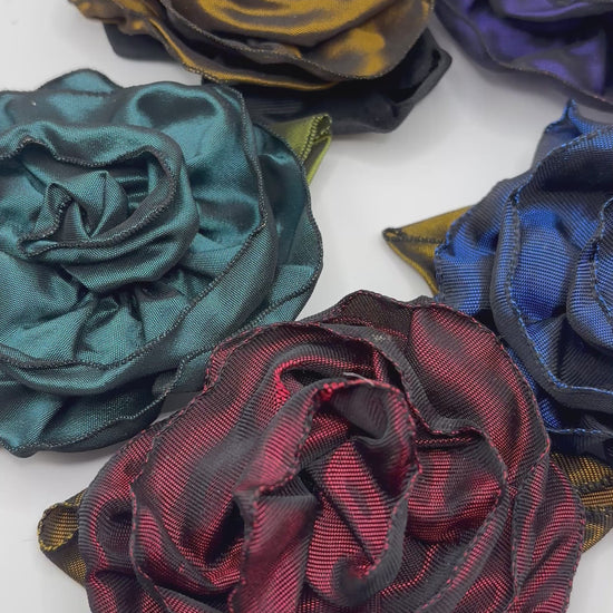 Karin's Garden 3" “Rosette” Pin and Clip. Pin or Clip to dress, lapel or wear as a boutonniere. Made in the USA. You can reshape the flower and leaves to make it larger or smaller. Strong, Nickel plate pin does not harm clothing.