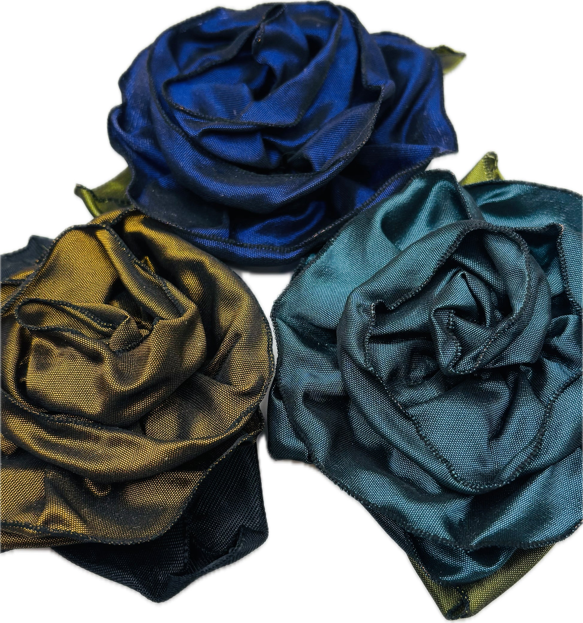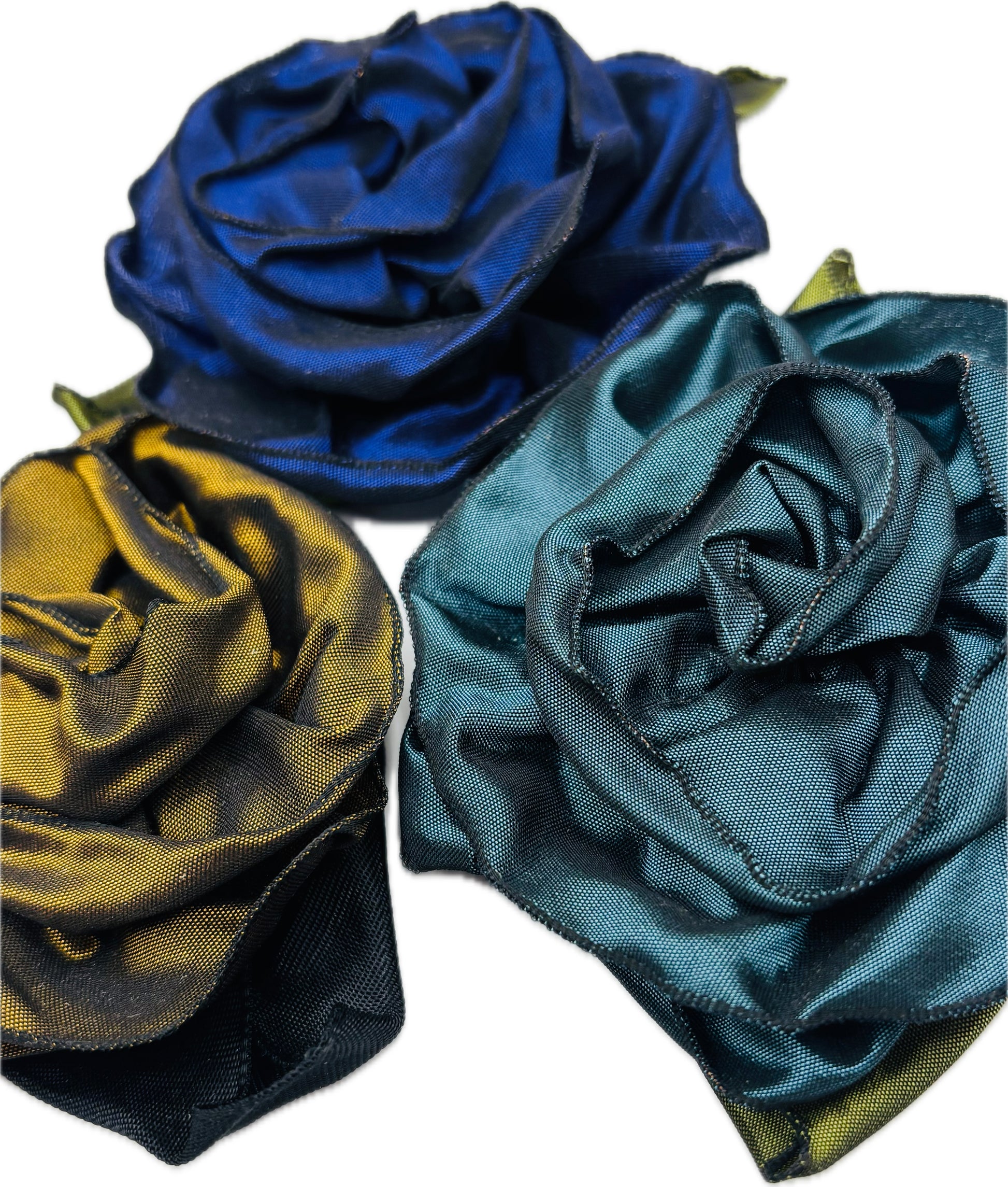 Karin's Garden 3" “Rosette” Pin. Pin to dress, lapel or wear as a boutonniere. Made in the USA. You can reshape the flower and leaves to make it larger or smaller. Strong, Nickel plate pin does not harm clothing.
